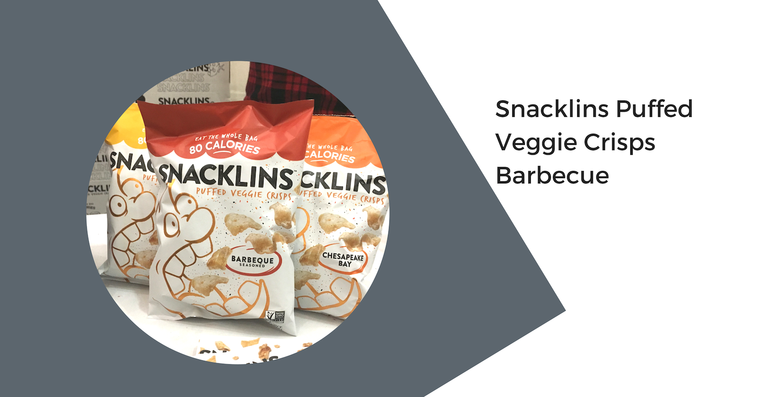 Snacklins Puffed Veggie Crisps Barbeque. At just 80 calories for the entire bag, these vegan crisps (similar in texture to pork rinds) are made with a blend of mushrooms, yuca root and spices.
