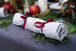 Homemade placemats can be made from a wide variety of materials, such as linen fabric, wooden plaques, greenery, burlap, cork, or even sturdy paper decorated with stamps. Consider involving the kids! Then complete the look by adding plates with a cloth napkin in the center topped with a pinecone, cinnamon stick and dried orange, or piece of holly.