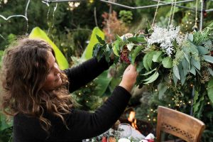 Use chicken wire to sculpt a base for your chandelier, and stuff it with natural greenery such as cedar boughs and/or holly from your backyard. No yard? Greenery can often be purchased from a florist (or ask a friend who has a backyard!). Use S-hooks and a chain or rope to hang the chandelier.