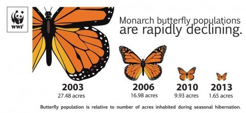 Scientists have pinpointed three culprits related to the monarch decline. The first is climate change. Extreme hot and cold weather, as well as torrential storms have affected monarch’s migration both south and north. A severe unseasonably cold storm in 2010 is reported to have killed millions of monarchs during their trek.