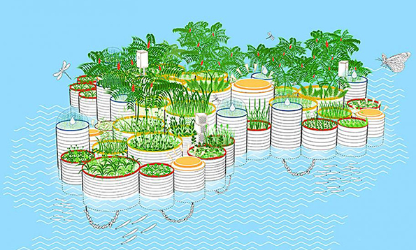 The garden contains over 30 plant varieties, including sumac, smooth cordgrass, and seaside goldenrod. Some of the plants, such as swamp rose mallow, draw water directly from the canal and work to improve its quality through desalination and phytoremediation, a process by which plants detoxify water contaminated with heavy metals or excess minerals. Collected rainwater, and water distilled with solar-powered equipment (housed in small domes on the garden’s raft), help keep the rest of the plants hydrated and happy.