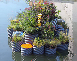 But residents and volunteers aren’t waiting around for the EPA to finish dredging up and sealing off all the toxic sludge at the bottom of the canal—a project that isn’t due to be completed until 2022. In the meantime, the Gowanus Canal Conservancy is working to create greener spaces both within the canal and along its banks. Their most ambitious project yet is a floating garden housed in metal culvert pipes, which are supported by hundreds of recycled plastic bottles and 55-gallon plastic drums.