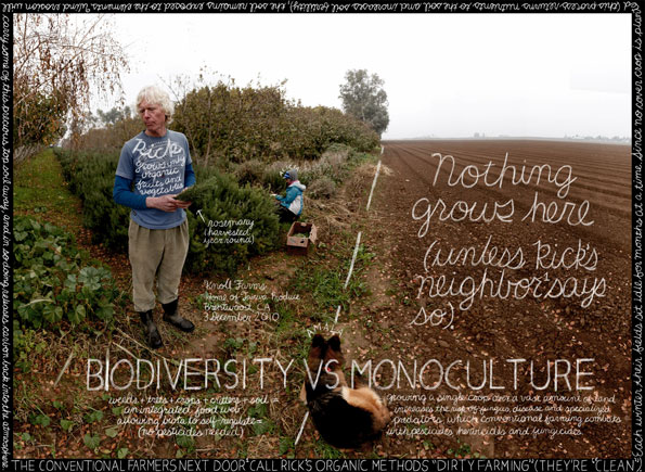 The conventional farmers next door call Rick’s organic methods “dirty farming” (they’re “clean”). Each winter their fields sit idle for months at a time. Since no cover crop is planted (a process that returns nutrients to the soil and increases soil fertility), the soil remains exposed to the elements. Wind erosion will carry some of this precious topsoil away, and in so doing releases carbon back into the atmosphere. Monoculture is growing a single crop over a vast amount of land, which increases the risk of fungus, disease and specialized predators. Conventional farming combats these problems with pesticides, herbicides and fungicides.