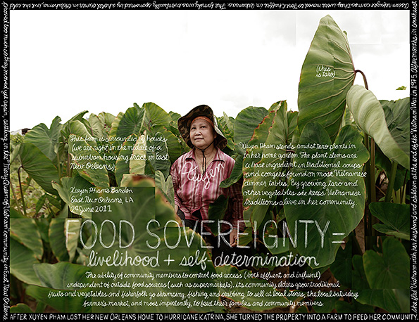 For Xuyen, food sovereignty requires both livelihood and self-determination. It’s the ability of community members to control food access independently of outside food sources. It’s community elders grow traditional fruits and vegetables and fisher folk go shrimping, fishing, and crabbing to sell at local stores, the local Saturday farmer’s market, and most importantly, to feed their families and community members.