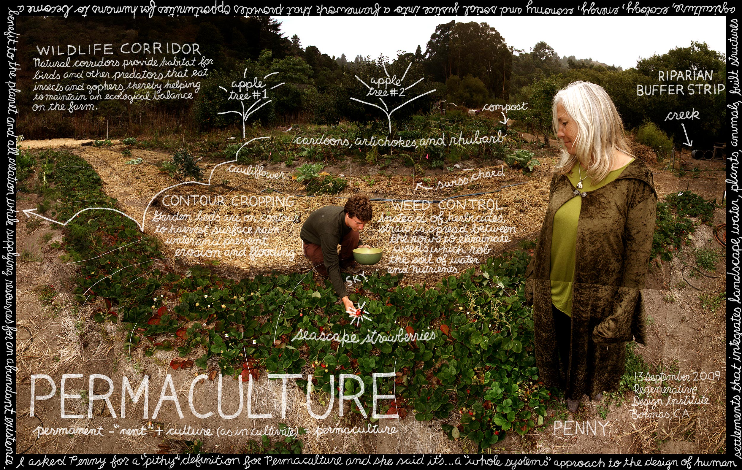 Penny Livingston, a farmer and educator in Bolinas, California, stands in her garden and witnesses her surroundings differently than most. Bird migrations, deer movement, and even raccoons passing along the creek’s steep banks define a wildlife corridor—all around and above. These must be carefully preserved. Willows, native currants, and hazelnut trees line the creek. These create natural riparian buffers, earthen barriers that hold the farm’s vital soil nutrients in the ground instead of them leaching into nearby waterways. Curves gently cut into the soil create to create contoured swales. These capture rainwater, redirecting it into the ground, where it can be utilized by nearby plant roots. FInally, food forests, multilayered gardens, allow some crops to be planted above and below each other. These carefully considered design principles, each inspired by lessons learned from the natural world are examples of permaculture.