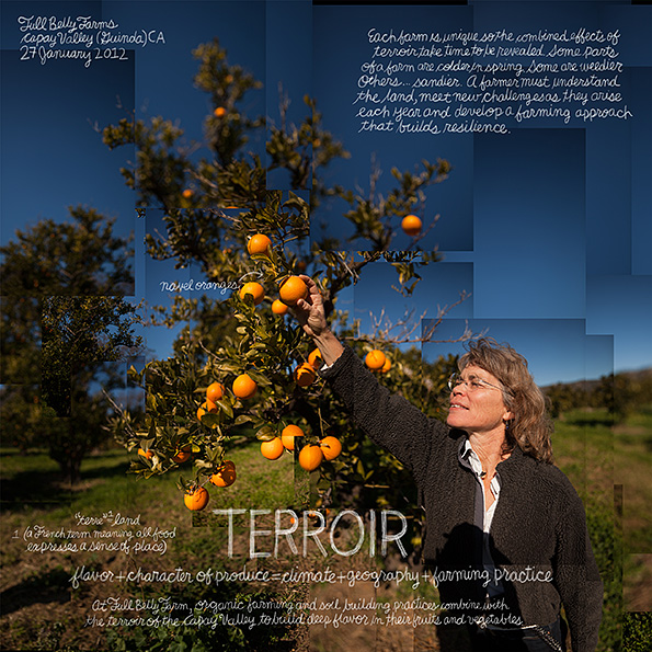 Each farm is unique, so the combined effects of terroir take time to be revealed. Some parts of a farm are colder in spring. Some are weedier. Others, sandier. A farmer must understand the land, meet new challenges as they arise each year, and develop a farming approach that builds resilience. At Full Belly Farms in Guinda, California, organic farming and soil building practices combine with the terroir of the Capay Valley to build deep flavor in their fruits and vegetables.