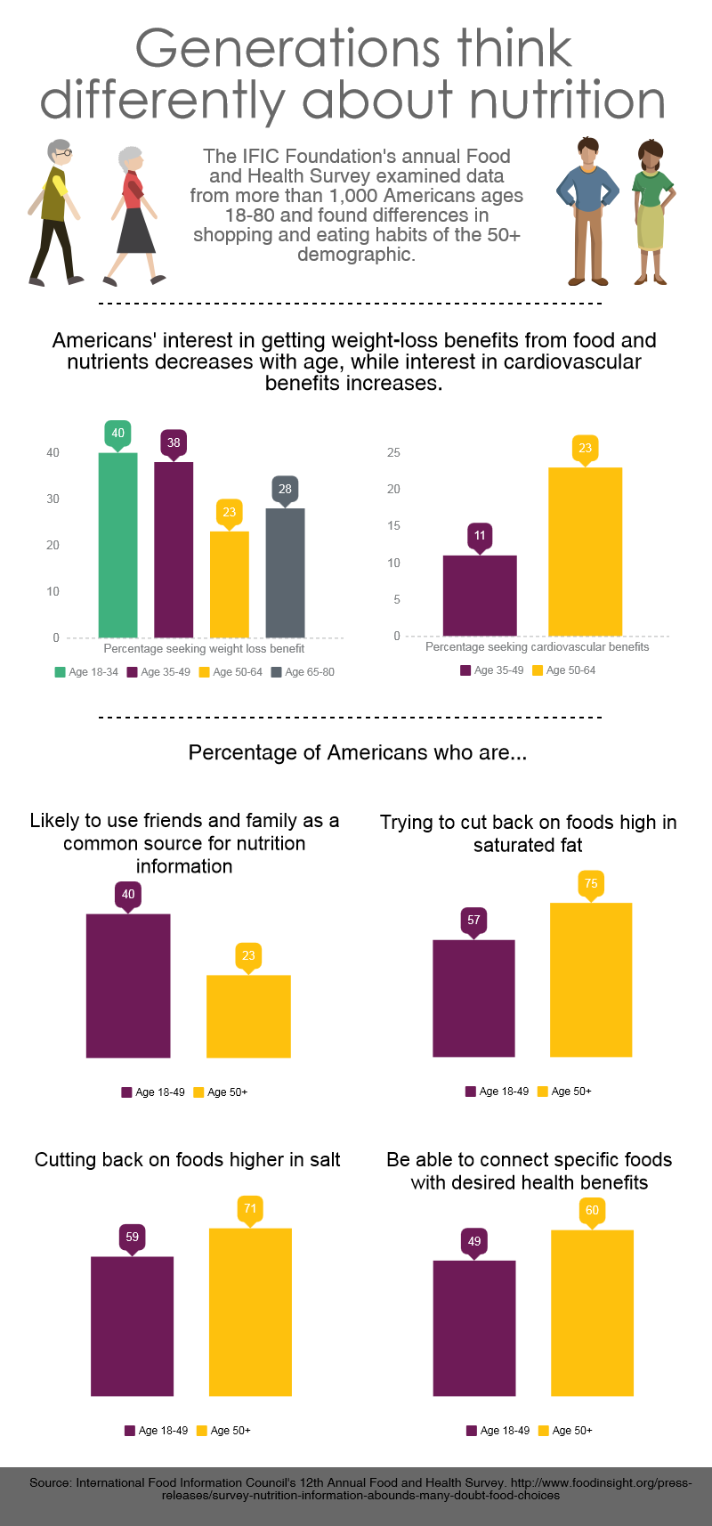 Americans rely on a variety of sources and consider a number of factors when making decisions about food and their health. In a recent survey of more than 1,000 consumers, the International Food Information Council Foundation found that baby boomers and older Americans—the country's fastest-growing demographic—diverge significantly from other groups when it comes to food attitudes and decisions. They tend to use fewer information sources when deciding what to eat or avoid, and to be more confident in their choices overall.