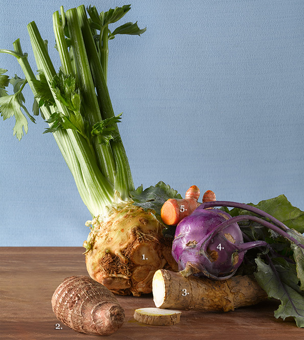 1. Celery root. Don’t judge this homely vegetable, also called celeriac, by its looks; it tastes like a cross between celery and parsley. For slaw, cut off the thick outer skin and shred the root; mix with 2 tablespoons mayo, 1 tablespoon mustard, the juice of half a lemon, and salt and pepper to taste. Serve cold.
