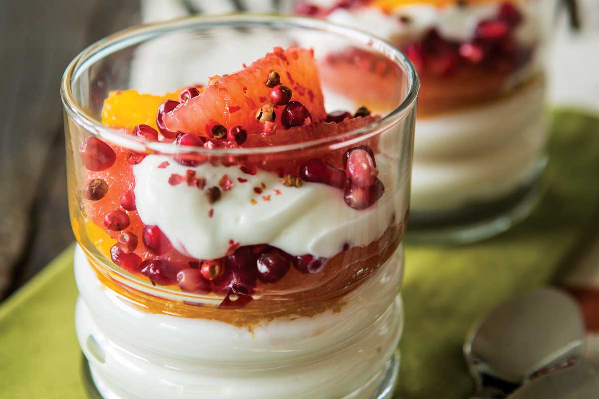 In medium bowl, whisk together yogurt, honey, and vanilla. Divide into four serving jars. Top with fruit and pink peppercorns. Serves 4.