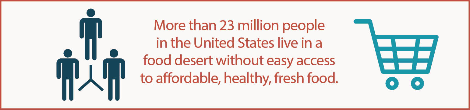 According to the USDA, more than 23 million people in the United States live in a food desert—a census tract, normally a low-income one, where at least 500 people or 33 percent of the tract’s population reside more than one mile from a supermarket or large grocery store that offers affordable, healthy, fresh food options. Many of the residents of these neighborhoods also lack reliable transportation to get to a large store; faced with the option of not eating at all, they often turn to convenience stores, small corner markets and fast-food restaurants and end up paying higher prices for less-healthy options like fatty and salty processed foods.
