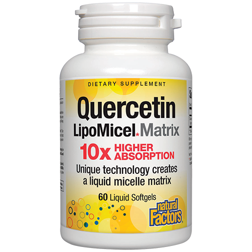 | Natural Factors Quercetin LipoMicel Matrix provides 10 times higher absorption. Our unique patent-pending technology creates a liquid micelle matrix that disperses the quercetin into tiny microdroplets, resulting in a superior delivery system for enhanced absorption and efficacy! naturalfactors.com | |