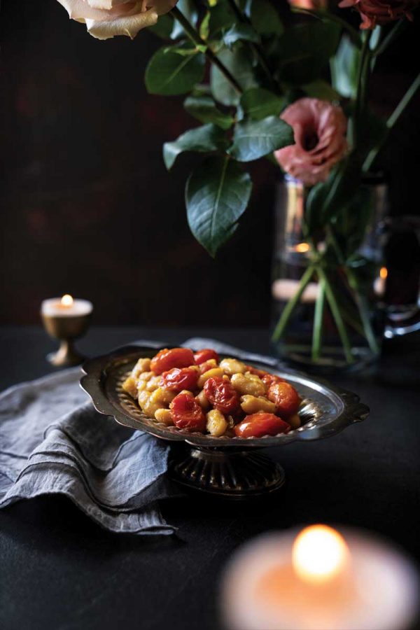 - In medium saucepan, heat olive oil on medium-high. Add shallots and sauté for 3 minutes. Add garlic and anchovies and stir for 30 seconds, being careful not to burn the garlic. Add white wine or vermouth to deglaze pan. Next, add beans, tomatoes, bay leaf, and saffron, and cover with stock. Stir and let braise for 20 minutes, or until liquid is absorbed, stirring occasionally. Remove bay leaf once ready, and dish into shallow bowl for sharing.