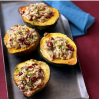 This year I’m opting for acorn squash, a festive winter squash, striped with flashes of dark green and orange, that looks beautiful on a Thanksgiving table. I plan to halve and roast the squash until it’s fork-tender. Then, I’ll stuff the insides with a mixture of cooked quinoa, almonds and craisins. Maybe I’ll sprinkle goat cheese over the filling and then place the stuffed squash back into the oven until the cheese gets golden and verges on melting. I’ll garnish this beautiful, simple dish with a shower of fresh parsley, and then I’ll serve it to the people I love. It’s a scene so lovely, I’m sure no one will miss the meat!