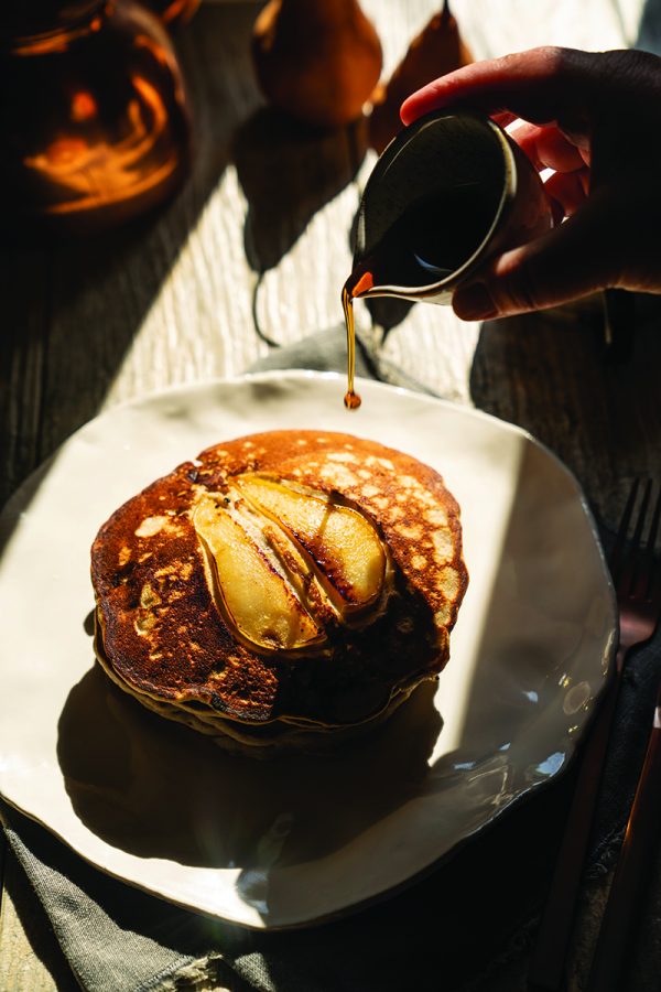 - Brush nonstick griddle or skillet with oil and heat on medium-high until surface is hot. For each pancake, place 2 slices of pear on griddle and allow to brown for about 30 seconds. Pour 1/4 cup batter over them. Grill on one side until bubbles start to appear on the surface of the pancake. Using thin spatula, carefully flip each pancake, being careful to keep it together. Grill on the other side for 1 to 2 minutes more. Serve with a drizzle of maple syrup.
