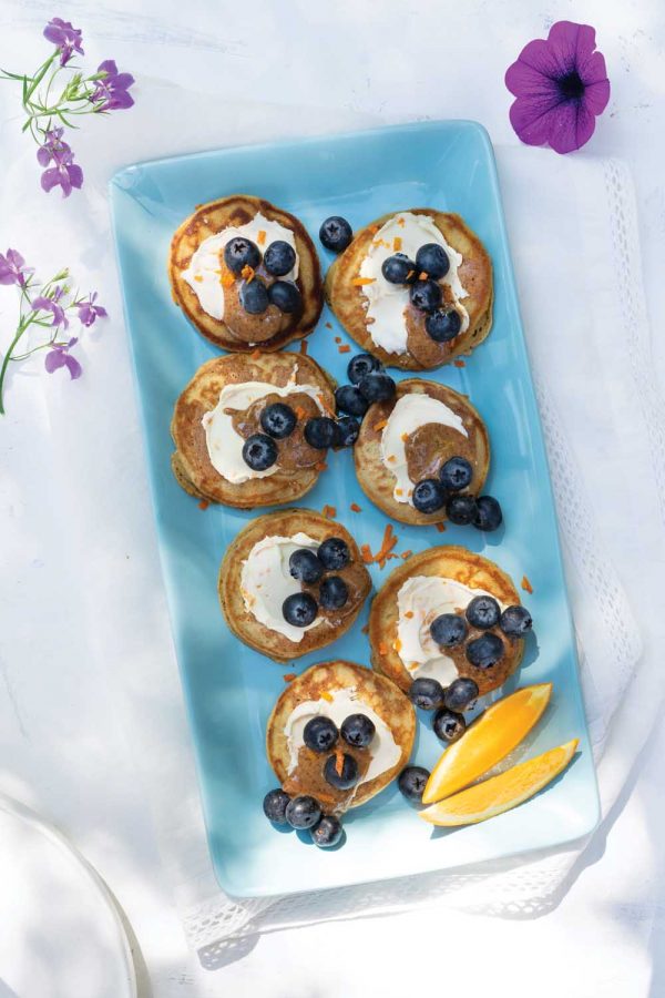 - To serve, spread about 2 tsp each cream cheese and almond butter on a mini pancake and top with about 2 tsp blueberries. Top with another mini pancake.