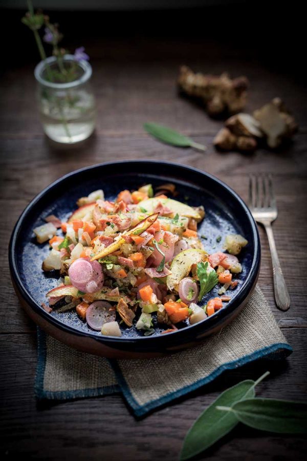 Weekend breakfasts offer the time for creating a satisfying meal. When it comes to hash, one can include any number of ingredients, such as squash or sweet potatoes, and even top it with a poached egg for extra protein. In our version, we added sunchokes (also called Jerusalem artichokes) for a lovely texture and flavor that’s perfect for the season.