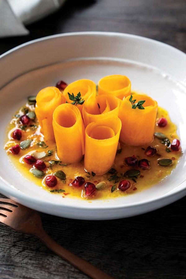 Yes! When in peak season and peak flavor, you can enjoy butternut squash raw. Ribbons of its sweet buttery flesh bejeweled with pomegranate and pumpkin seeds make for a vibrant salad that is much easier to put together than its good looks would suggest. And an orange marinade is the secret flavor booster in this recipe. The longer the squash marinates, the more tender it will become, making this a good make-ahead salad option.