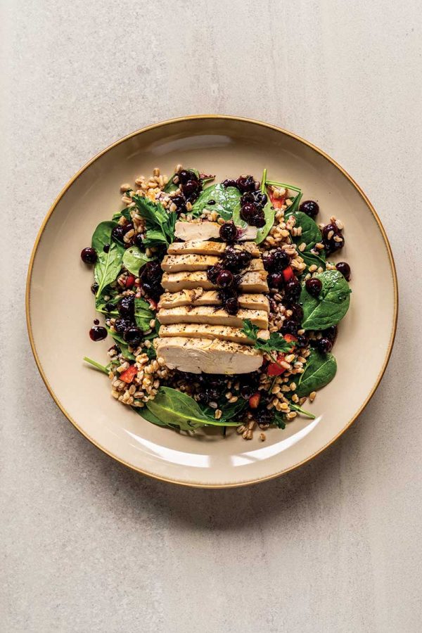 The sweet-tart warm blueberry dressing is a wonderful counterpoint to the earthy elements of this simple yet satisfying salad. All the cooked elements of this salad—berry dressing, chicken, and farro—can be prepared ahead of time and then assembled for a quick weeknight meal. If farro is not available, other grains, including spelt berries, sorghum, or quinoa, can be used.