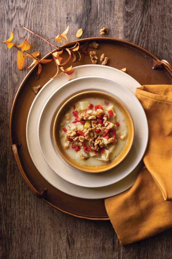 - Ladle stew into serving bowls and garnish with roasted peppers and walnuts.