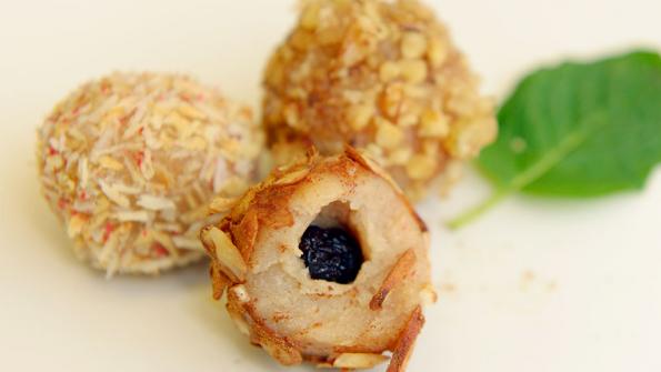 Created at Bauman College as part of the 2013 Bhakti Chai Recipe Challenge, these beautiful sweet rice balls–Korean gyung dan–are easy to prepare and have endless topping variations (you could even use crushed cookies or chopped trail mix). These bite-size treats vegan and gluten free, too.
