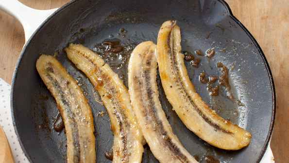 - Choose a skillet large enough to accommodate all banana pieces and place it over high heat. Add butter and swirl to coat pan. Add bananas, cut side down, and cook for 1 minute. While bananas are cooking, sprinkle with any remaining sugar-cardamom mixture. Turn bananas over and cook for 15 seconds more. Remove from skillet and divide among plates, with the browned cut sides up.