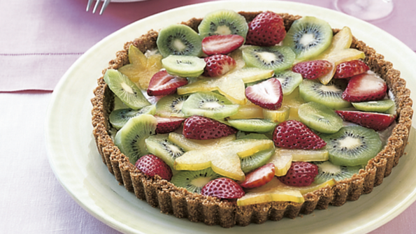 - Arrange kiwifruit, carambola, and strawberries on top of filling. Serve chilled.