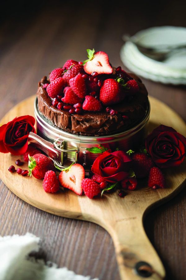 - When ready to serve, garnish with red berries and a drizzle of chocolate, if desired. Slice and serve.