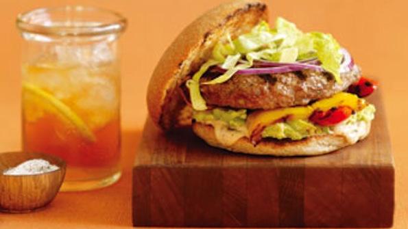 - During final 2–3 minutes of cooking, place buns, cut side down, on grill and toast. Remove and spread both sides of each bun with mayonnaise. Spread with avocado and top with peppers. Place burgers on top of peppers, and top with lettuce leaves and onion slices, if desired; then cover with bun tops. Serve immediately.