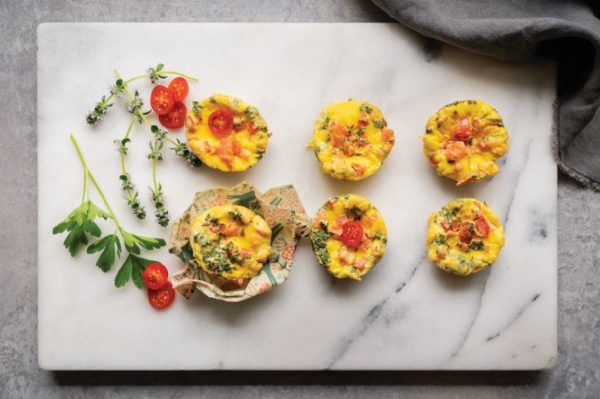 To easily store these frittatas, place them on a plate, cover them with beeswax wrap, and refrigerate. Beeswax works like plastic wrap, only better—it’s not plastic and therefore free of petrochemicals! It softens when you warm it with your hands, making it easy to stretch around a plate or bowl.