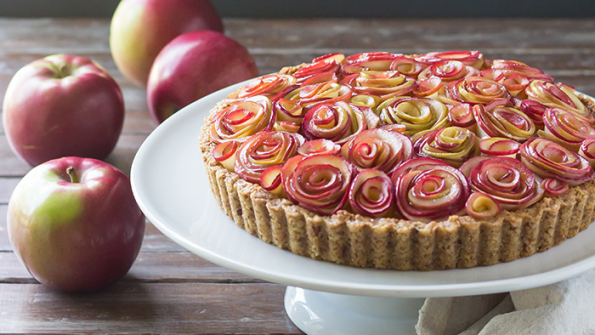 This tart will be the centerpiece of your dessert table: a crunchy, gluten-free walnut crust with a creamy maple-custard filling, topped with a bouquet of apple roses.