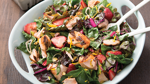 - To assemble, arrange chard on a serving platter. Top with shredded beet, salmon, pickled shallots (drained from step 1), strawberries and pistachios.