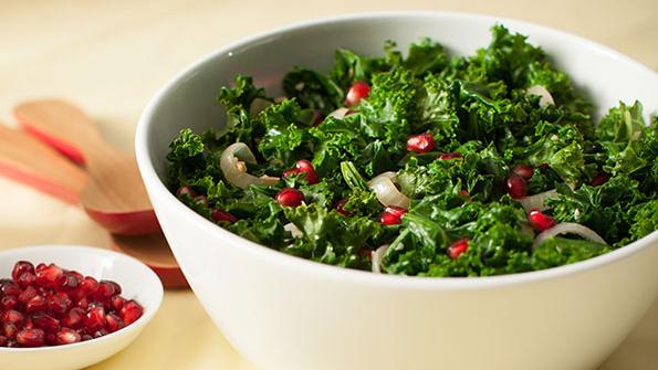 Pomegranates’ abundant polyphenols and potassium benefit your heart, and kale is chock-full of minerals, vitamin K, and anticancer sulforaphane. Peel away a pomegranate’s pithy white sections to reveal the tart-sweet, crimson seeds; or look for ready-to-eat seeds in your market’s refrigerated fruit section.