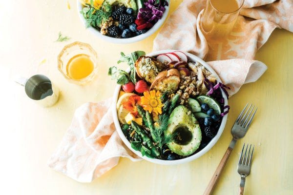 - In large bowl, toss together quinoa and spinach. Divide mixture between 2 serving bowls. Top each bowl with flaked trout, rainbow-colored fruits and veggies, avocado, and honeyed walnuts. Garnish with edible flowers and fresh herbs, if desired.
