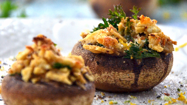 Crunchmaster's White Cheddar Multi-Grain Crackers (certified gluten free) give these delicious stuffed mushrooms an extra boost of flavor and a satisfying crunch.