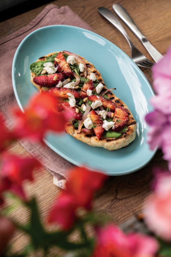 - While grilling flatbreads, you can also grill the onion and plums. Place onion face down on grill and grill for about 4 minutes, until nicely charred. Grill plum halves at the same time, turning once, about 4 minutes total. The fruit will take less time than the flatbread, so when they’re done, place fruit on top rack of grill to keep warm.