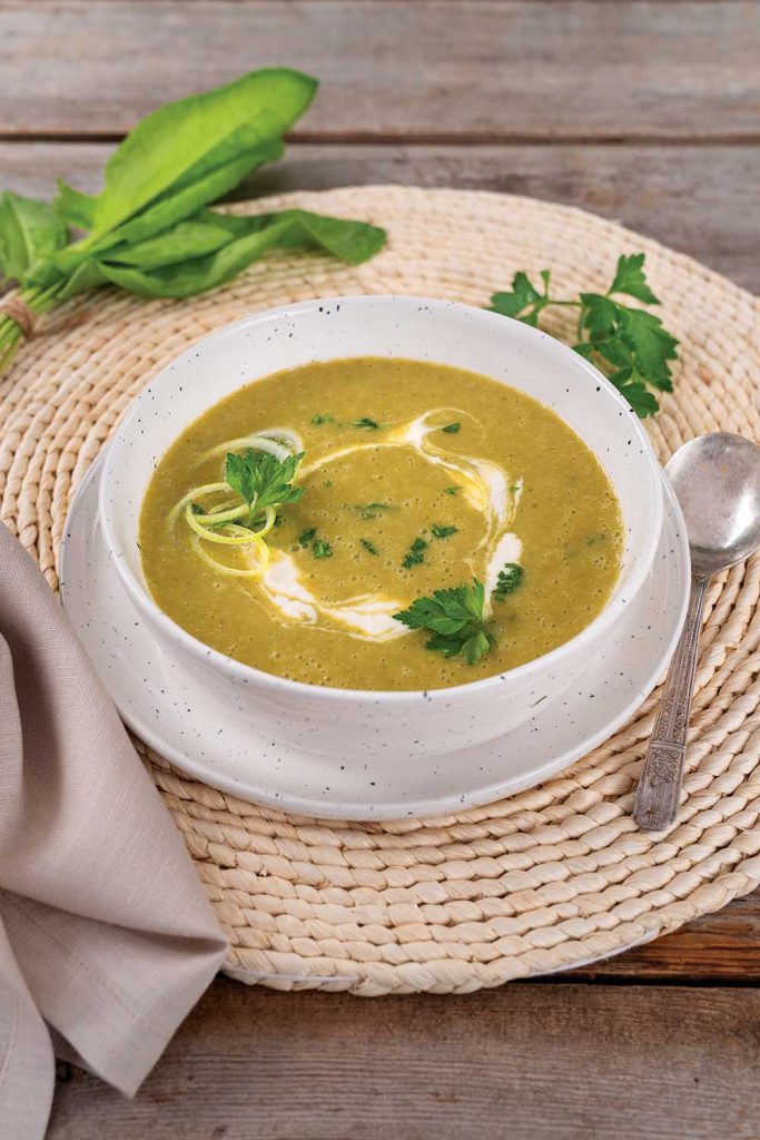 Sorrel Soup with Leek, Potatoes, and Almond