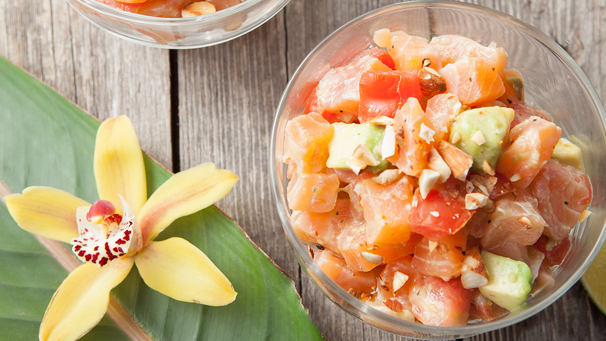 Lomi-lomi is a traditional Hawaiian salt-cured salmon salad, in which salt is massaged into fresh salmon to marinate and "cook" it slightly. In fact, "lomi-lomi" is a Hawiian word used to describe massaging or kneading. Buy the freshest salmon you can get, and ask for a piece that is as evenly thick as possible, which will make it easier to cut into cubes later. Most good fishmongers will also remove the skin for you. Serve this ceviche-like salad with crackers, over rainbow quinoa or stuffed into lettuce leaves.