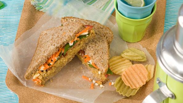 Serves 4–6 / For easy transport, wrap sandwiches in biodegradable waxed paper, or spear each half with a toothpick and pack in an airtight container. Prep tip: Purchase grated carrots from the salad bar for quick assembly.