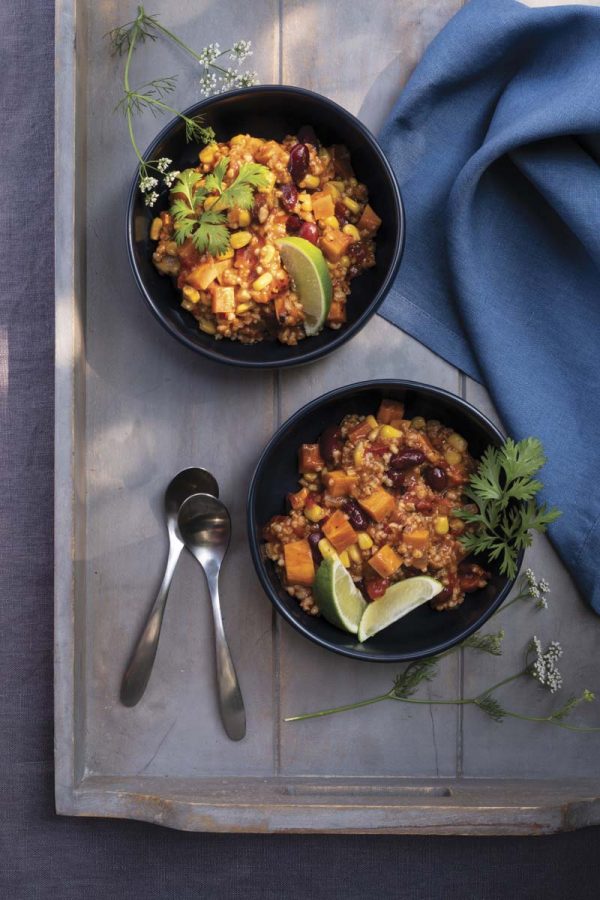 If breakfast oatmeal is your jam, you’ll happily spoon up this oat-infused hearty chili. Oat Sweet Potato Chili comes together quickly enough to add to your weeknight dinner routine, but soaking the steel-cut oats ahead of time is key to having them cook more efficiently. Toppings run the gamut of avocado, sour cream, broken tortilla chips, cilantro, or grated cheddar.