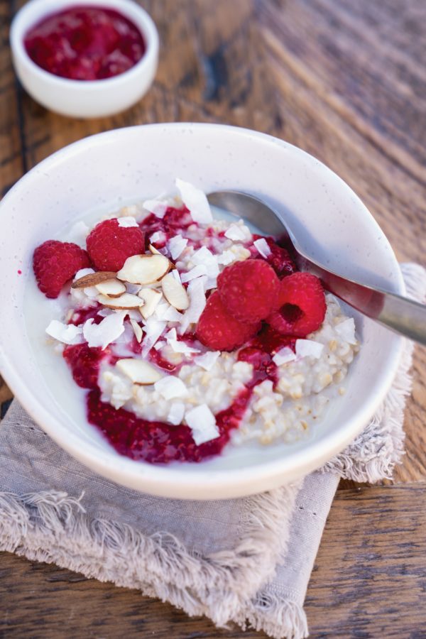 - Divide oatmeal among serving bowls and swirl in raspberry chia jam. Garnish with peanuts and coconut chips (if using).