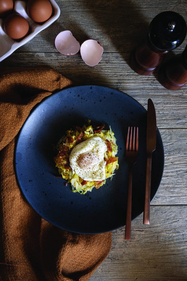 This dish makes a delightful lunch or brunch and a nice helping of vitamin D. It cooks up in minutes and delivers the satisfaction of good old bacon and eggs. Just a hint of chili and the tiniest bit of serrano ham bring tons of flavor to the hearty cabbage.