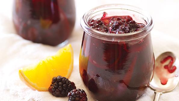 Dark and mysterious, this soft, beautiful mixture could be used as a base under tarts and custard desserts. Or spoon it right out of the jar onto breakfast pancakes or after-theater crepes. The apples and orange peels add pectin, shortening the time the conserve takes to set. Still, it will take about a half hour.