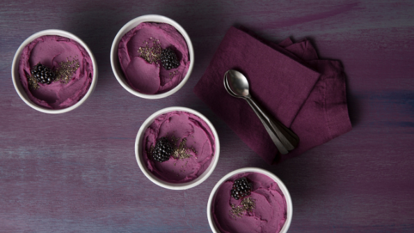 Purple sweet potatoes provide a more vibrant color than other types of purple potatoes. The texture of these gluten-free, dairy-free, vegan desserts is similar to bread pudding with subtle sweetness and a quiet vanilla-cinnamon finish. Chia seeds add unique crunch.