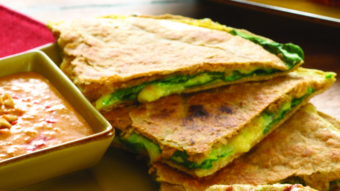 - Top tortilla with about 1 teaspoon clarified butter and flip. Cook other side a minute or two, until lightly browned. Slide onto a cutting board. Repeat with remaining ingredients. Cut into wedges and serve warm.