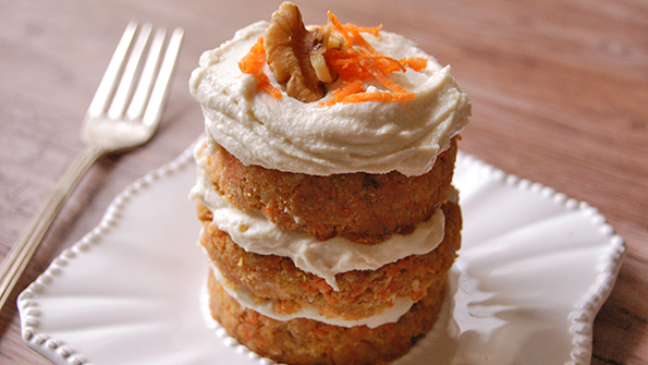 - To form cake or cupcakes: Press “batter” into a plastic wrap–lined cake pan or muffin tin. Then pull sides of plastic wrap to lift cake out of mold. Ice the top of the cake or cupcake. To make miniature layered cakes, use a 4-ounce cylinder juice glass to cut out small cake-layer rounds. Frost and stack the layers. Garnish with additional raw walnuts, cinnamon and/or a bit of grated carrot.