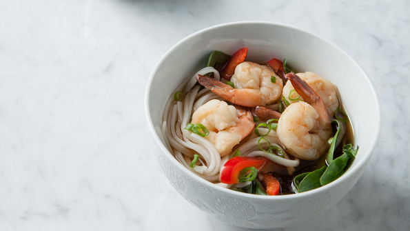 - Put miso in a small bowl. Add a few spoonfuls of hot tea; then mash miso, gradually adding more tea as necessary to form a slurry. Pour slurry into tea in saucepan. Stir to combine. Bring broth to a gentle simmer. Add shrimp and bell pepper. Bring to a simmer once again; then cover and gently poach over low heat for 2 minutes. Remove from heat, keeping pan covered.