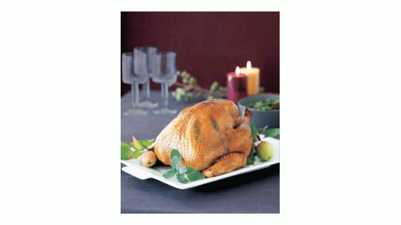 This turkey is the perfect size to cook in four hours and should provide ample servings (plus leftovers). Fresh sage tucked under the skin and cheesecloth draped over the turkey keep the rich flavor and moisture inside the bird. The sage leaves also add a dramatic, decorative touch. Serve with organic cranberry sauce, if desired.
