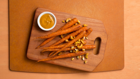 Turmeric-spiced cashews and yogurt dipping sauce are the perfect orange complements to tender, sweet roasted carrots.