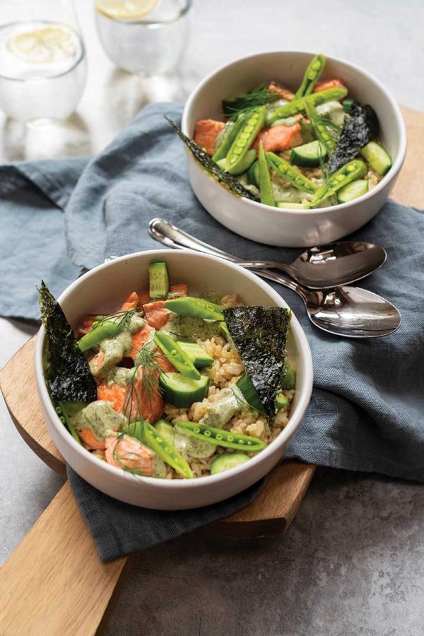 - Divide rice, salmon, cucumber, and peas between 2 bowls and top with desired amount of dressing.