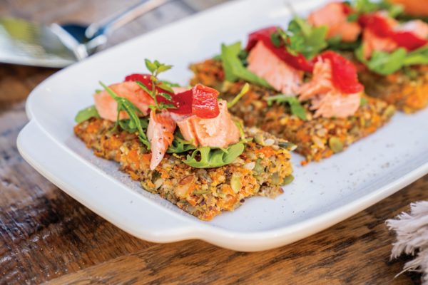 These Seedy Carrot Flatbreads with Roasted Salmon are guaranteed to do away with #saddesklunch. Assemble just before serving. Instead of mustard, you can add a smear of cream cheese. Rainbow trout or arctic char are good swaps for salmon.